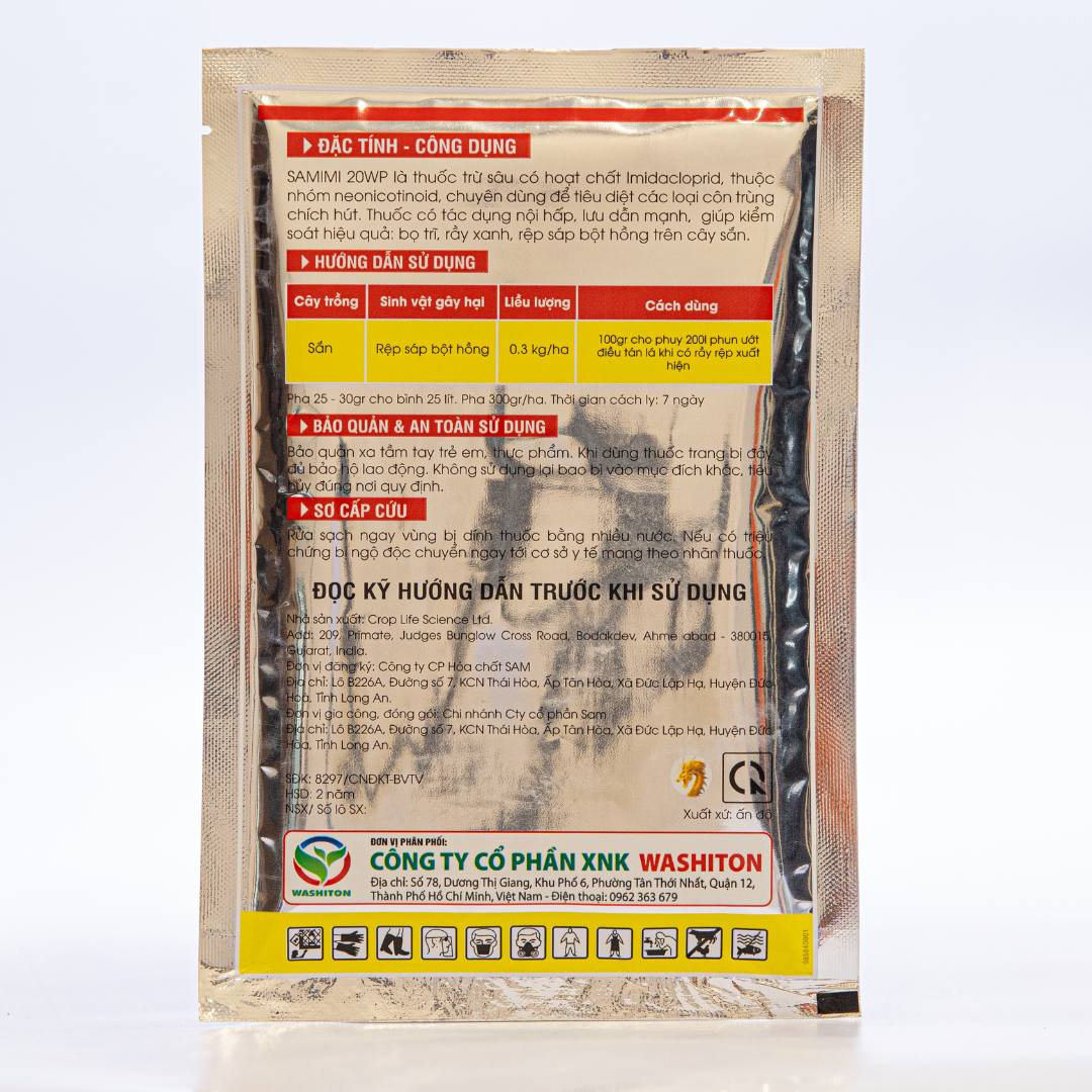 SAMIMI 20WP là thuốc trừ sâu có hoạt chất Imidacloprid, thuộc nhóm neonicotinoid, chuyên dùng để tiêu diệt các loại côn trùng chích hút.