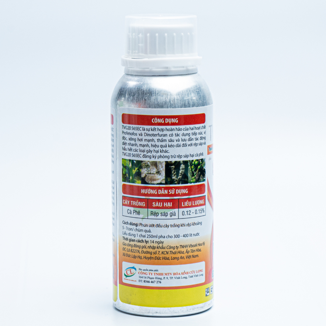 TVG20 565EC là sự kết hợp hoàn hảo của hai hoạt chất Profenofos và Dinotefuran có tác dụng tiếp xúc, vị độc, xông hơi mạnh, thấm sâu và lưu dẫn tác động diệt nhanh, mạnh, hiệu quả kéo dài đối với rệp sáp và hầu hết các loại gây hại khác.